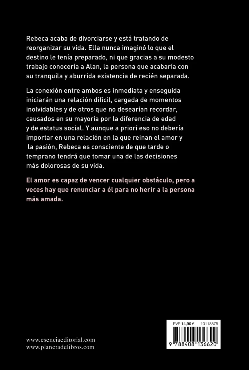 Rebeca acaba de divorciarse y está tratando de reorganizar su vida. Ella nunca imaginó lo que el destino le tenía preparado, ni que gracias a su modesto trabajo conocería a Alan, la persona que acabaría con su tranquila y aburrida existencia de recién separada.